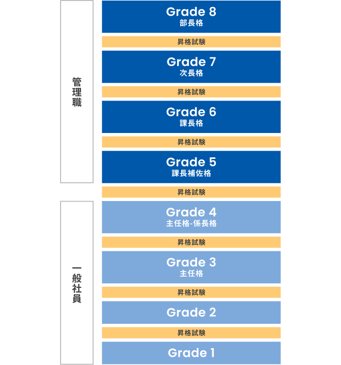 グレード(等級)は、各階層ごとに実施する昇格試験に合格することでステップアップしていきます。「何をクリアすれば昇格できるのか」が明確なため、目指すべき姿が具体的に描けます。