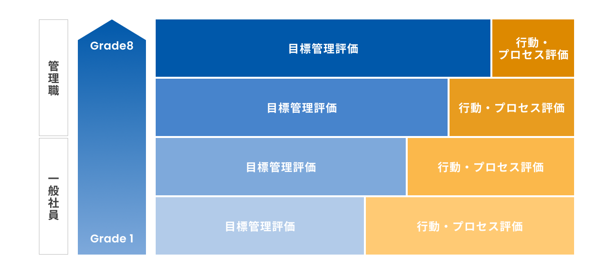 個人のパフォーマンスを目標管理(目標の達成度)と行動・プロセス評価の2つの軸で評価します。
